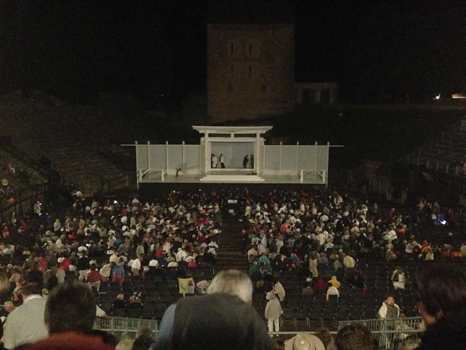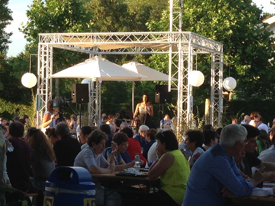 L’ambiance est sympathique dès l’arrivée dans le parking ou une navette attends les spectateurs. « Alors vous montez à pied ou avec nous ? ». Même si le chemin qui mène aux arènes est court, il est néanmoins pentu et la navette est la bienvenue. En ce jeudi 7 juillet, le beau temps est au rendez-vous, les spectateurs profitent de déguster des plats du cru et japonais, tout en écoutant une chanteuse revisitant des tubes à la sauce jazz. 20h45, tout ce petit monde se dirige vers les arènes avec coussins, jumelles, paniers pique-nique, etc…