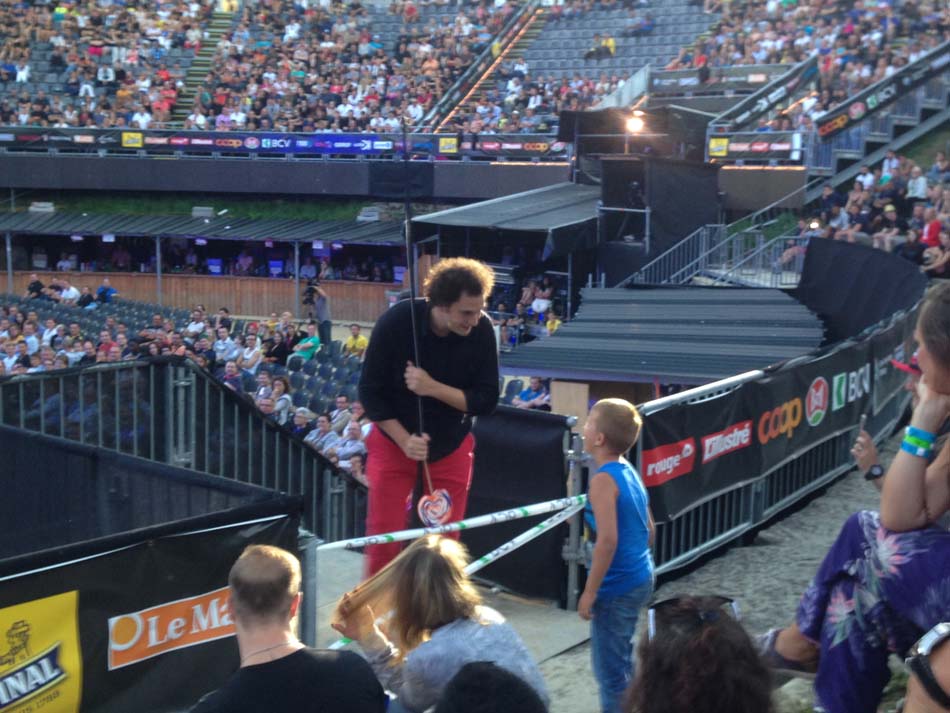 C’est celui qui fait de plus en plus parler de lui, qui ouvre pour la soirée les arènes d’Avanches, l’humoriste-magicien Eric Antoine. Environ ¾ des places étaient occupées et le public était chaud pour l’accueillir. Pour ma part, je m’attendais à de la magie à outrance et j’ai été étonné en bien. La magie a sa place, mais l’humour prend le dessus et surtout Eric Antoine est au taquet avec le public rentrant en interaction avec lui… le faisant participer. Nulle peur, il invite tous les enfants présents à monter sur scène pour leur montrer un tour de magie.