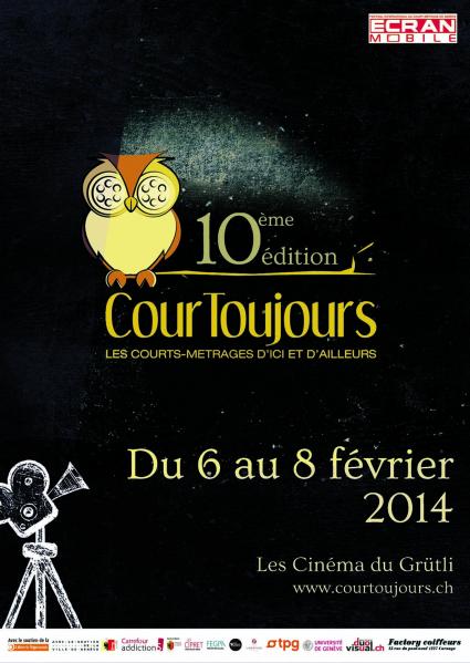 Du 6 au 8 février 2014, le festival CourToujours (anciennement nommé Festival International du Court-métrage de Genève) fête ses dix ans d’existence au cinéma du Grütli. Organisé depuis deux ans par une nouvelle équipe passionnée et bénévole ayant repris le flambeau de l’association Ecran Mobile, sorte de pendant romand du festival des courts-métrages de Winterthur, il vise à faire découvrir et promouvoir ce format parfois méconnu qu’est le court, en Suisse et à Genève. Il offre également une plate-forme d’échange entre les réalisateurs du monde entier et le public, et soutient dès qu’il le peut les auteurs suisses et internationaux.