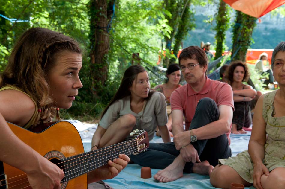 Du machisme surtout, du sexisme aussi, deux attitudes qui font la part belle à l’humour dans la comédie française de manière générale. On a vu pire dans Gangsterdam et ses blagues sur les « viols cools », et, même si ce n’est pas un concours, ici Problemos se fait une jolie place dans le classement des films au sexisme ambiant si fatiguant à la longue. Victor bave comme un adolescent demeuré face à une adolescente de seize ans qui en paraît dix-neuf – allusion gratuite à l’abus sexuel de mineure ainsi qu’à la représentation sursexualisée du corps féminin – et fait le sprint de sa vie pour courir chercher de l’huile au campement afin de lui en étaler sur le corps. Marié et père d’une petite fille, il n’hésite pas non plus à manifester soudainement son intérêt pour le polyamour, mais se rétracte dès qu’une femme plus vieille, un peu ronde et peu séduisante répond à ses avances. Ne se sentant pas concerné, il va également partir en courant, ou tout du moins tenter de le faire, du « Cercle des Femmes » qui aborde la thématique du flux instinctif libre, des tampons et du « problème » des règles. Il est très intéressant et honorable de mettre en avant cette pratique peu connue et d’en parler dans un film grand public, mais très décevant d’en faire, à nouveau, un sujet de moquerie, de sexisme, en l’associant à une pratique hippie, qui remet en cause la connaissance féminine du vagin et de la vessie par les femmes elles-mêmes, et en tournant directement au ridicule plutôt que de valoriser ou au moins de développer un minimum la question.