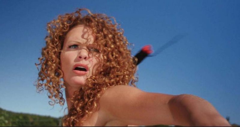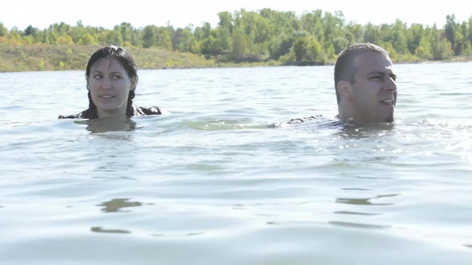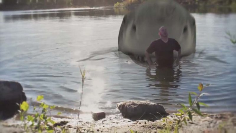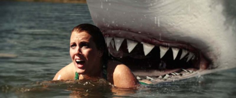 C’est donc sans surprise que l’actrice principale, Emanuelle Carriere, n’a pas fait une longue carrière dans le métier justement. Plus rien depuis 2014 si j’en crois sa fiche IMDB. N’espérez pas mieux des dialogues, d’une platitude affligeante et souvent illogiques, mais ce n’est pas pire que le scénario qui, lui, déborde d’incohérences. Rien que le lieu de l’action pose problème : une île abandonnée au centre d’un lac, supposément à des kilomètres de la terre ferme… pourtant visible sur chaque plan, à quelques centaines de mètres. Le mégalodon survit donc sans-souci dans l’eau d’un lac, et peut carrément nager vers le rivage… là où les protagonistes ont pied. Et je vous parle des traces de pneus sur le sable ou de la présence de pylônes électriques ? Bref, autant dire que le film sent l’amateurisme à plein nez, et l’absence de budget est flagrante. Ce qui explique le gros requin aux CGI prêtant plus à sourire ou rire qu’autre chose, ainsi que diverses explosions au rendu grotesque.