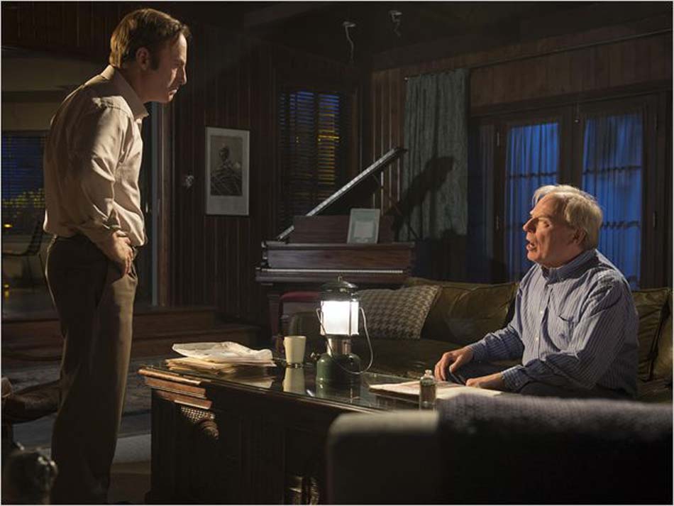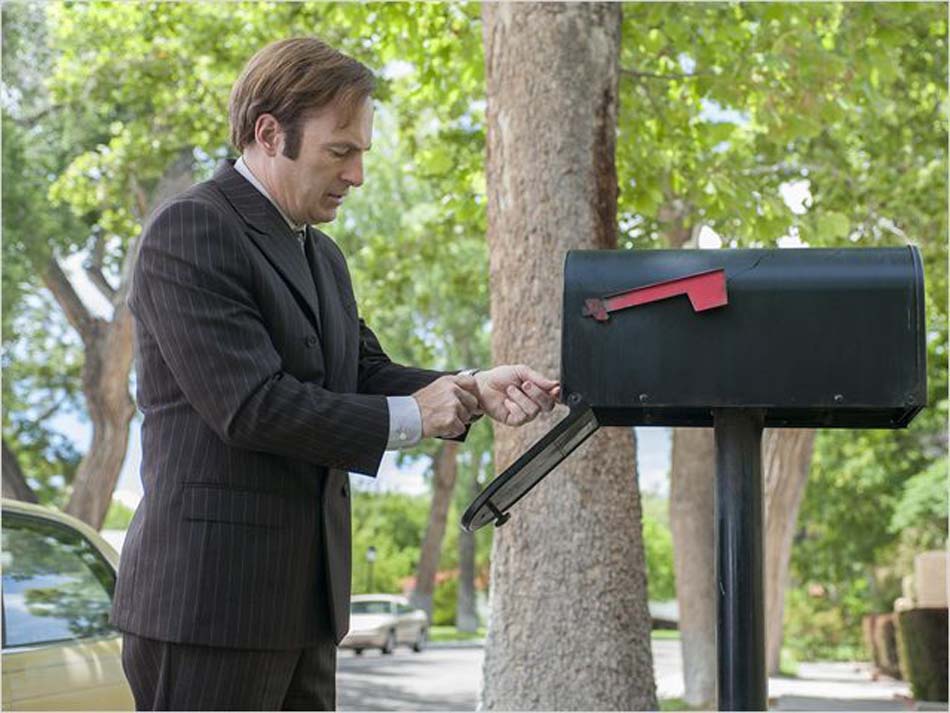 La grande idée de cette première saison est de se concentrer sur les origines de Goodman. Alternant comme son aînée entre plusieurs temporalités, Better Call Saul décompose le personnage en deux figures distinctes : l’avocat James McGill (sa véritable identité) qui tente tant bien que mal de se faire un nom en restant du bon côté de la barrière, et le baratineur Sleeping Jimmy (son ancien surnom) qui arnaquait les touristes dans des bars miteux. La naissance de Saul Goodman nous est ainsi présentée par la confrontation entre ces deux identités. Peinant à joindre les deux bouts, le pauvre James McGill se retrouve tiraillé entre son passé d’arnaqueur et son désir de respectabilité. Toujours porté par l’interprétation géniale de Bob Odenkirk, le personnage gagne alors en complexité, tandis que l’on découvre son frère Chuck et la relation ambigüe qu’ils entretiennent, ou son amie Kim et la fragilité qu’elle fait apparaître chez lui. On croise également Mike Ehrmantraut, futur homme de main de Gustavo Fring dans Breaking Bad, qui n’en est encore qu’à gérer avec lassitude l’entrée d’un parking.