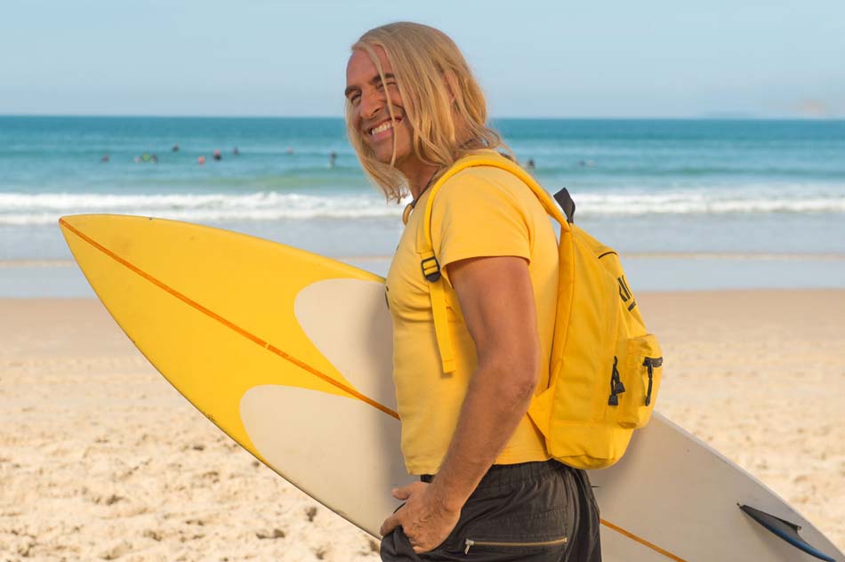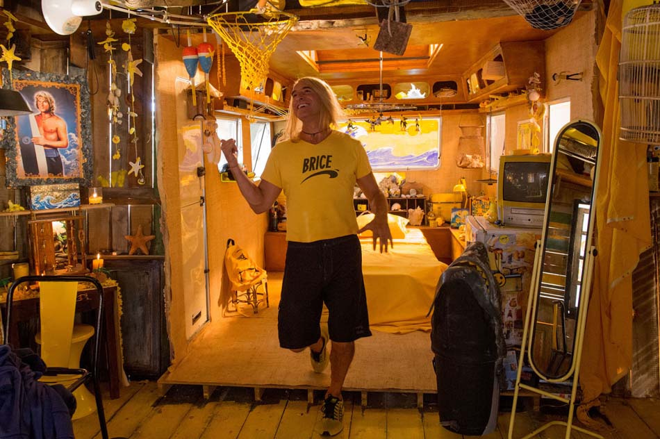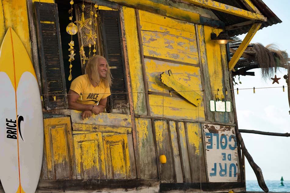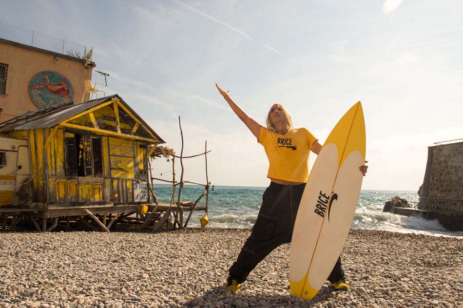 Chez Brice tout est jaune, ses T-shirts, bien sûr qui reprennent à l’envers le célèbre logo de la firme Nike, mais aussi la décoration de sa cabane qu’il a installée sur la plage. Sa passion c’est le surf, dans le premier épisode Brice rêvait de devenir un professionnel de la discipline comme son idole Bodhi (joué par le regretté Patrick Swayze), dans le film « Point Break » qu’il connaît par cœur.