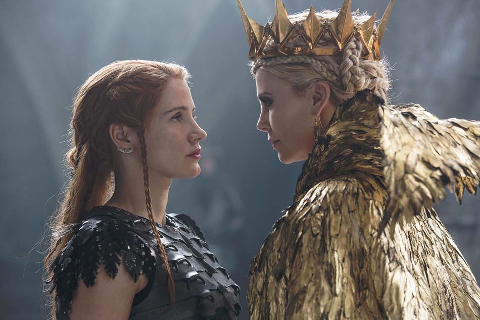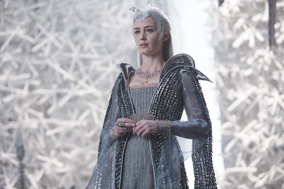 Maintenant que nous avons vidé notre sac, on peut dire que grâce à un visuel sans défauts et un très bon casting, le film réussit à nous embarquer dans cette aventure fantastique. Le trio Blunt/Hemsworth/Chastain délivre une belle prestation et fait des efforts pour donner plus de poids à leurs dialogues. Emily Blunt parvient à rendre la transition entre une femme épanouie et une reine au cœur glacial mais soumise aux doutes, finalement cohérente. Chastain est également un personnage fort, bien que dénué de pouvoirs et possède une bonne alchimie avec Hemsworth. Bien que la romance entre Sara et Eric soit interrompue rapidement et que leurs scènes amoureuses soient brèves, elles restent crédibles aux yeux des spectateurs. Hemsworth a un rôle plus important dans ce film que le précédent et montre qu’il est toujours aussi à l’aise dans les scènes d’action, mais qu’il arrive également à jongler entre sérieux et humour sans problème, avec un charme naturel. Charlize Theron reprend les traits de la sorcière maléfique et, encore une fois, vole la vedette à l’écran avec ses coiffures et costumes impressionnants, son maquillage doré et sa démarche assurée.