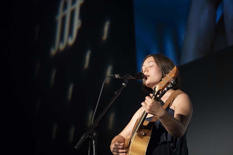 Puis, une jeune artiste douée est introduite et invitée à monter sur scène. Musicienne chevronnée avec sa guitare sèche et son chant, ayant déjà effectué de nombreux concerts au Japon, « Color of Rice » poursuivit la soirée en maîtrisant ses mélodies pop-country. Sa voix hypnotique accompagna à merveille les différents extraits du FFFH diffusés en parallèle. Après maints applaudissements du public, dont le mien, un des 2 co-fondateurs de la manifestation rejoignit les planches. Christian Kellenberger formula également plusieurs éléments à l’exemple de remerciements chaleureux et sincères pour le staff féminin du festival, les partenaires, le public et la co-fondatrice du FFFH, Mme Charlotte Masini.