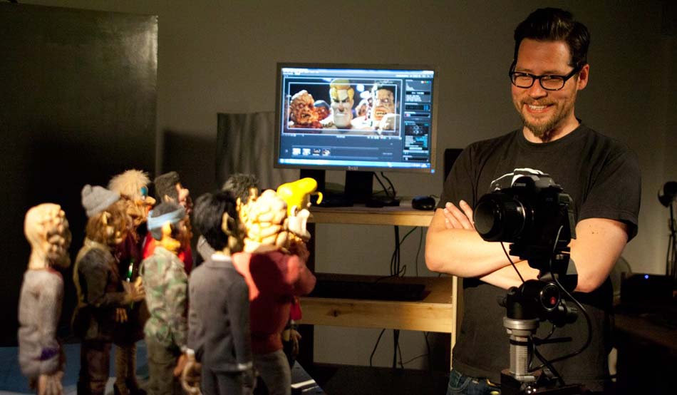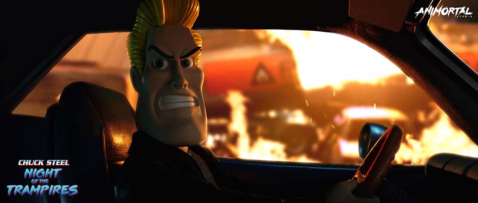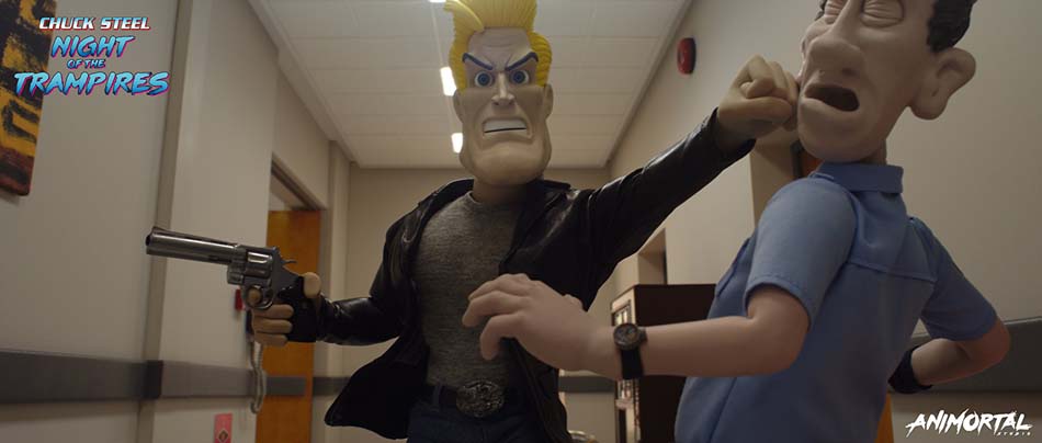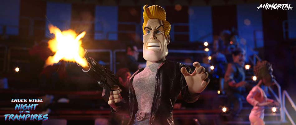 J’ai créé le personnage de Chuck Steel dans mes années d’école quand j’avais 15 ans, j’avais fait quelques courts-métrages dans mon sous-sol en 2012 d’à peu près 15mn et là j’ai rencontré mes partenaires qui ont trouvé les financements pour un Feature Film. Donc tout a été monté à South Wales, nous avons créé un studio appelé Animortal Studio, qui est l’amalgame de deux noms de studio, et nous irons de l’avant avec ce studio-là après que « Chuck Steel, Night of the Trampires » soit sorti. Nous avons terminé ce film, il y a seulement trois mois, mais le but est de faire d’autres Feature Films et des séries pour la télévision en stop-motion de haute qualité.