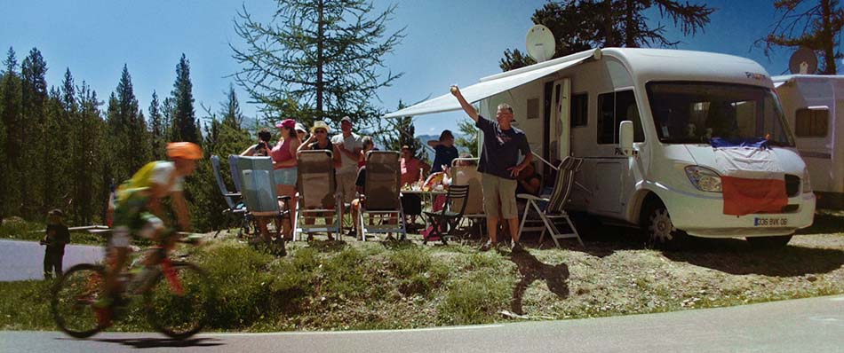 Des Ardennes au col d’Izoard, le long des départementales et sur les sentiers escarpés, une nuée de camping-cars s’élance pour célébrer le Tour de France. Le soleil réchauffe, les transats sont sortis, les copains arrivent : c’est l’été, la Grand-Messe commence !