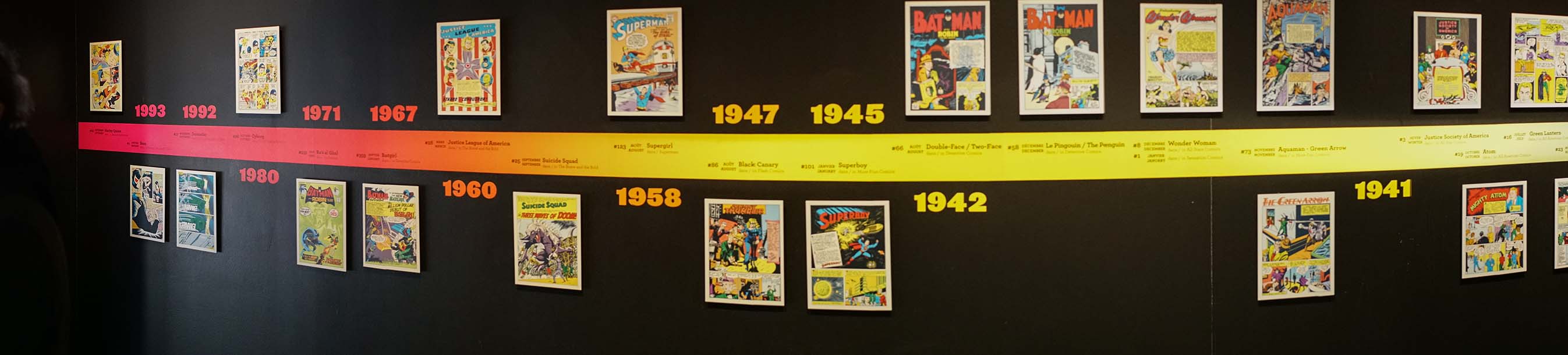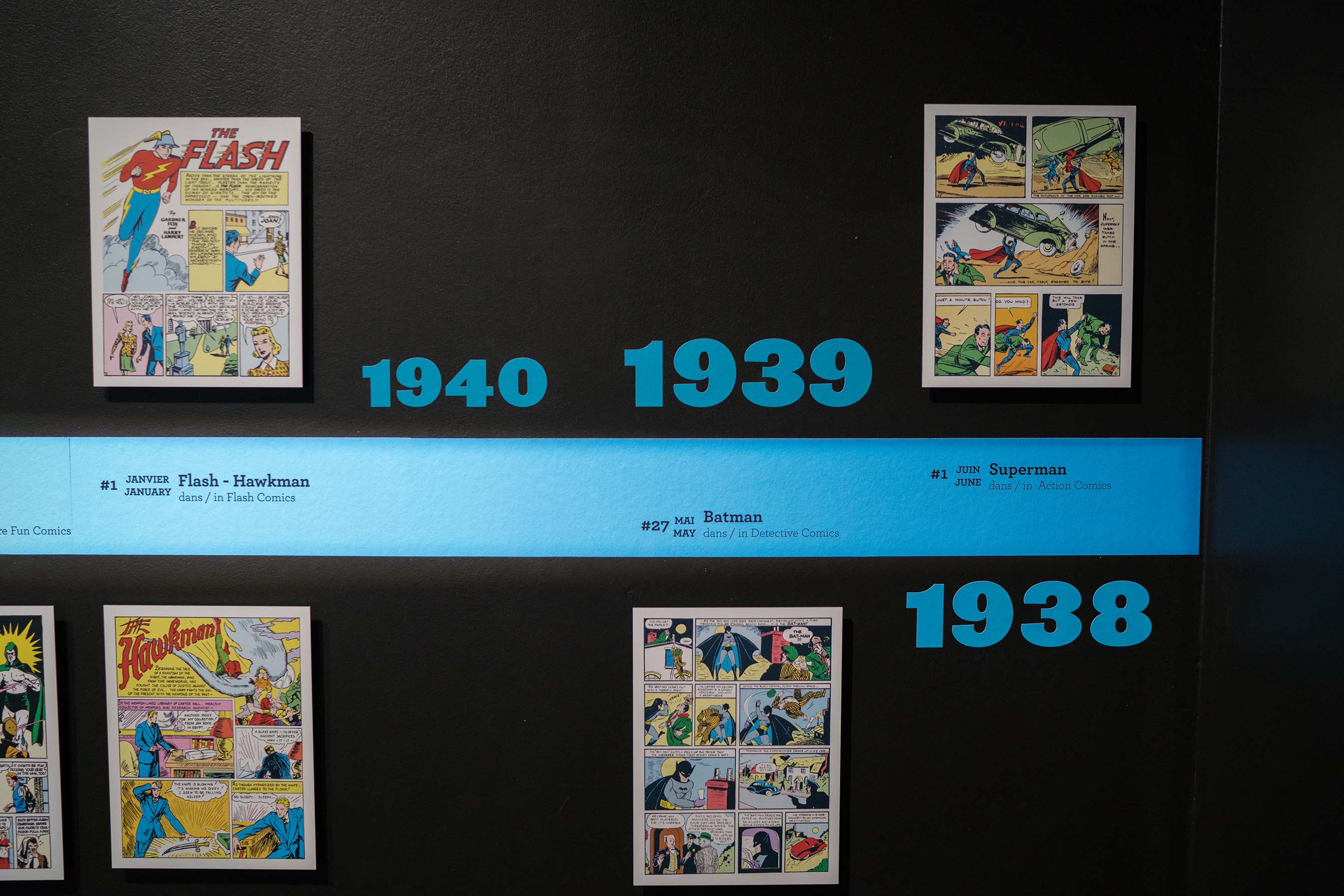 La rétrospective, soignée et méticuleusement développée du début jusqu’à la fin, suit entre autres la genèse de l’homme d’acier. C’est en 1938 que le Canadien Joe Shuster et l’Américain Jerry Siegel dessinèrent pour la première fois « Superman » qui parut dans l’édition initiale « Action Comics ». À l’époque, ce fut une véritable révolution et plusieurs influences s’en ressentirent. Notamment dans la littérature, la mode, la télévision et bien sûr le cinéma.