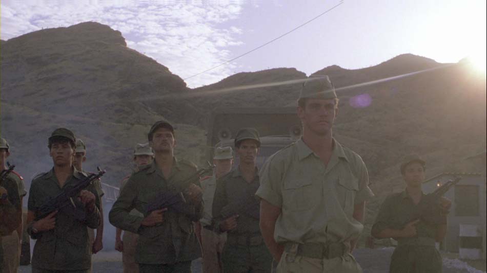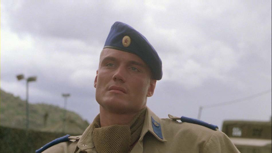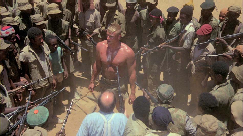 Autant le dire tout de suite : Scorpion rouge ne s’écarte à aucun moment de ces règles « obligatoires » et rend une copie quasi-parfaite par rapport à ce qui en est attendu. C’est ainsi que Dolph Lundgren joue le rôle d’un soldat russe des forces spéciales – il est bien évidemment leur meilleur élément – envoyé dans un pays d’Afrique pour éliminer un leader anti-communiste. Au cours de sa mission, le russe aux nerfs d’acier sera néanmoins taraudé par le doute devant les atrocités commises par les forces de son pays et finira par changer de camp.