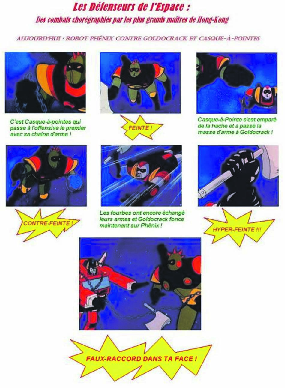Mais la véritable signature de Joseph Lai, ce sont les faux raccords. A partir de l’apparition du robot géant, cela devient un véritable running gag puisque le phénix stylisé peint sur son torse disparaît et réapparaît constamment, pas un plan sur deux, mais presque.