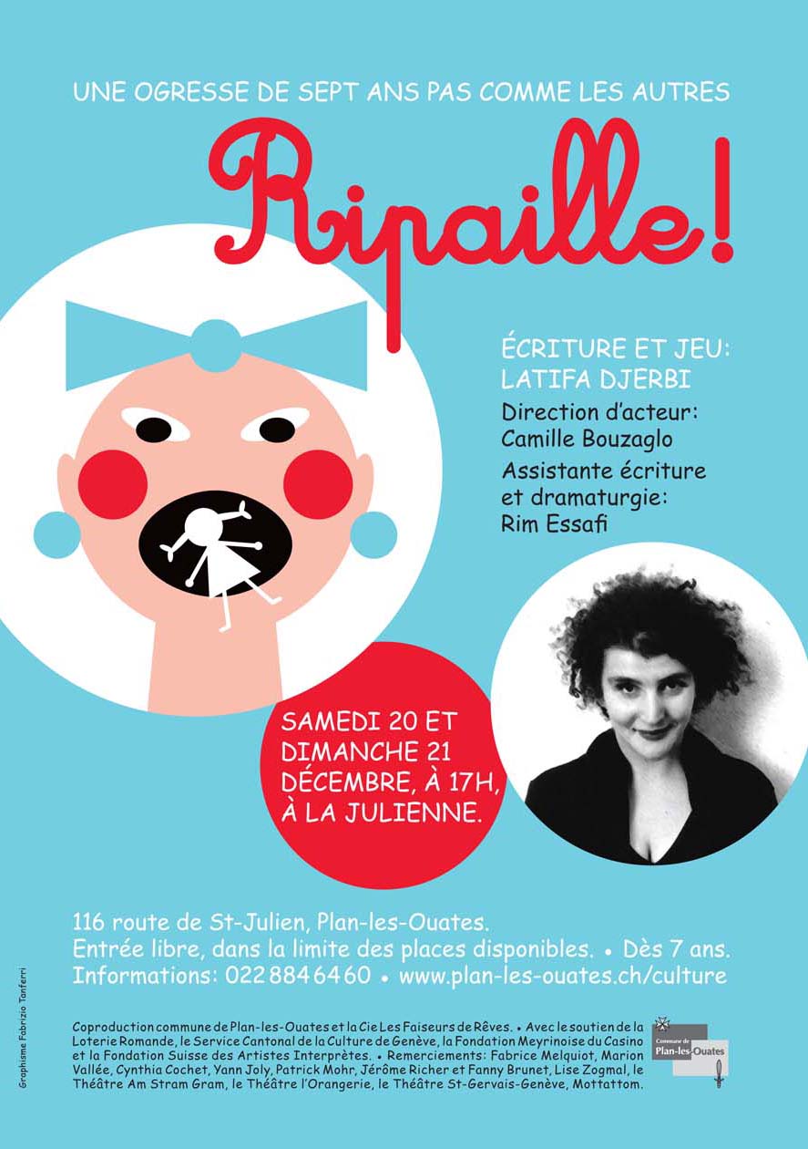 La petite ogresse Ripaille va avoir sept ans. Chez les ogres, sept ans, c’est l’âge où on mange son premier enfant! Mais on peut aussi découvrir l’amitié… Ripaille devra choisir son chemin à elle, rien qu’à elle. Ce conte moderne, écrit par Latifa Djerbi, revisite avec humour plusieurs contes classiques (Le Petit Chaperon Rouge, Le Petit Poucet, Peau d’Âne) pour aborder les questions du choix, de la liberté individuelle, de la force et de l’amitié.