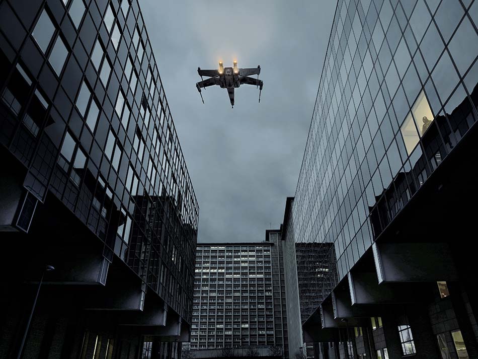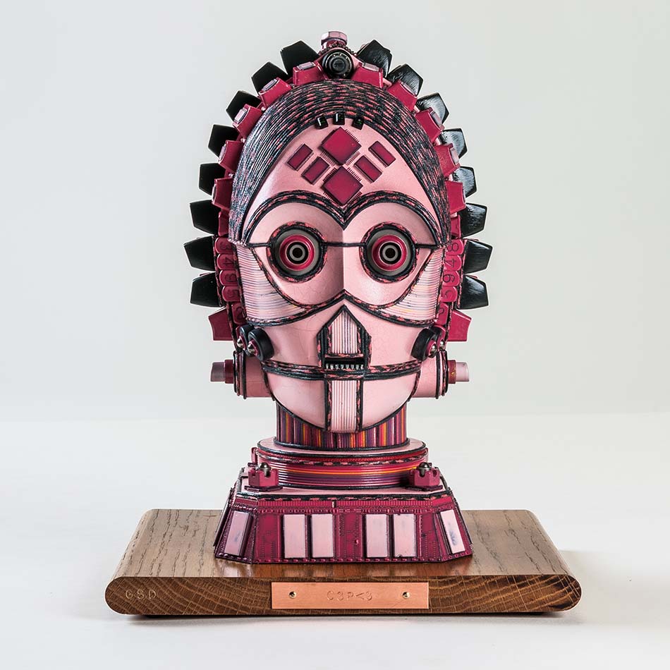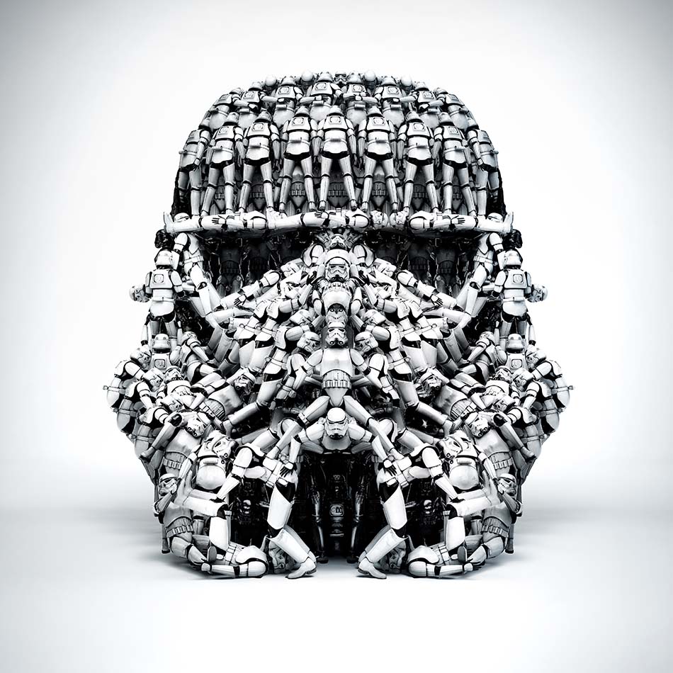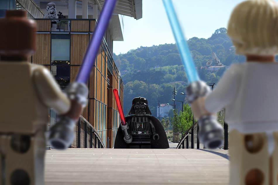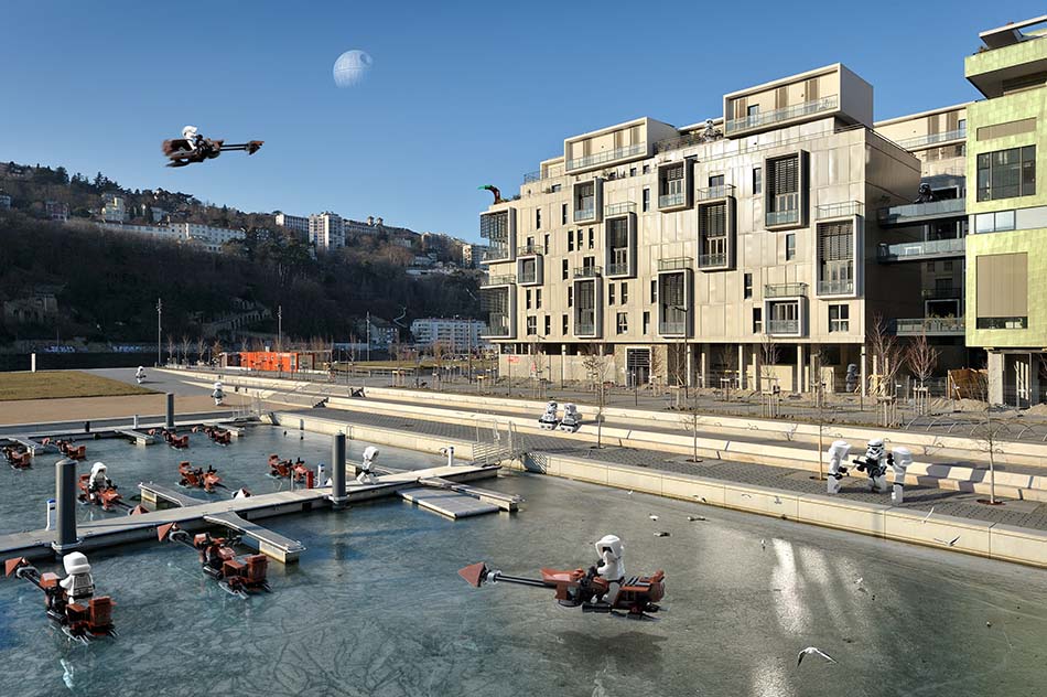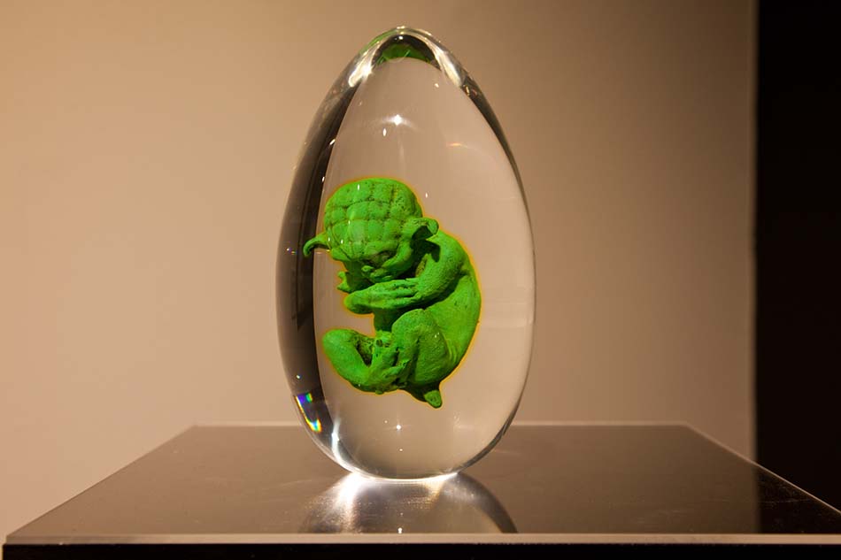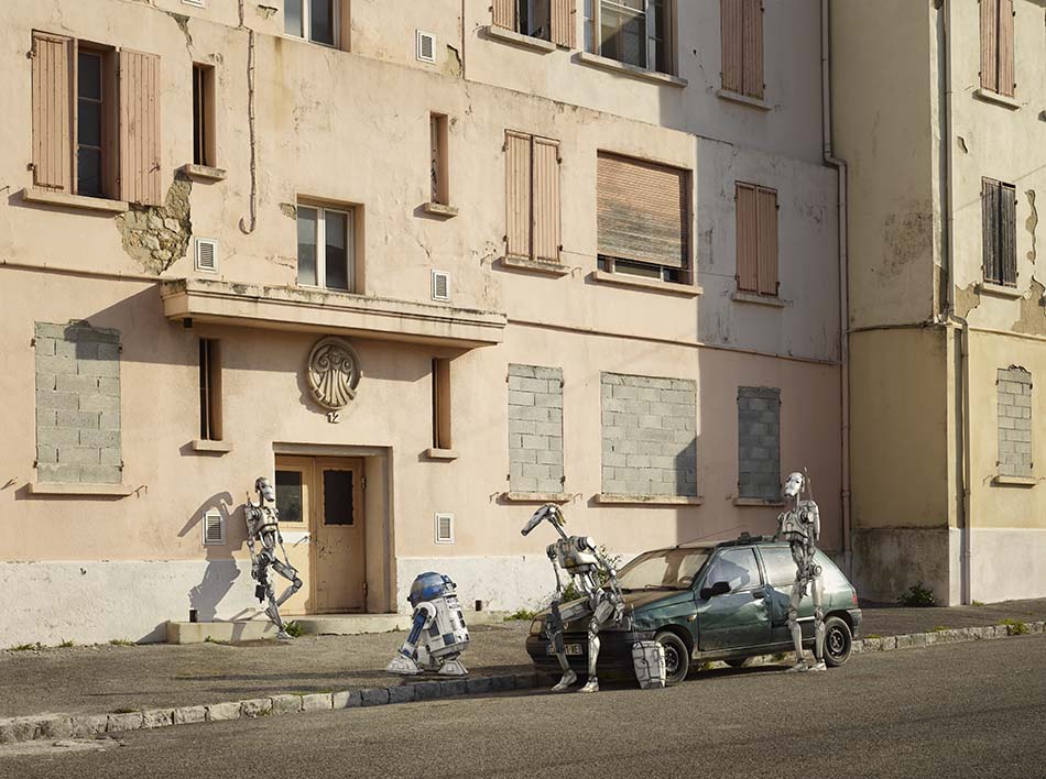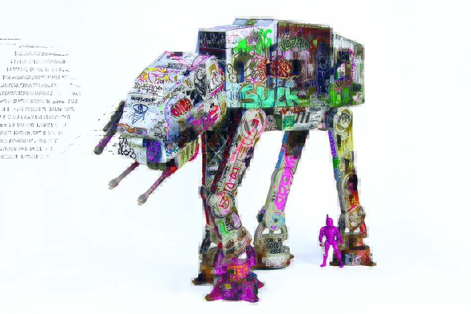 Mais si l’exposition prend en compte ce contexte historique, elle met l’accent sur les pères modernes de Star Wars, ces artistes contemporains qui se sont réapproprié cet univers pour en faire de l’art, leur art. La Maison d’Ailleurs expose 13 artistes, 13 pères, avec des approches singulières mais qui ont au moins un point commun : chacun utilise Star Wars comme matière première pour parler de sa vision du monde. Car, bien que fictif, l’influence de cette saga sur notre réalité n’est plus à prouver. Ainsi, Cédric Delsaux aime à raconter que la construction de l’immense tour Burj Khalifa aurait été inspiré aux architectes par le visionnement des gratte-ciels qui jalonnent la planète fictive de Coruscant dans Star Wars.