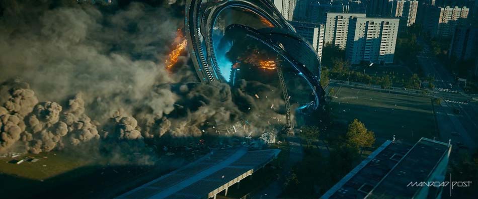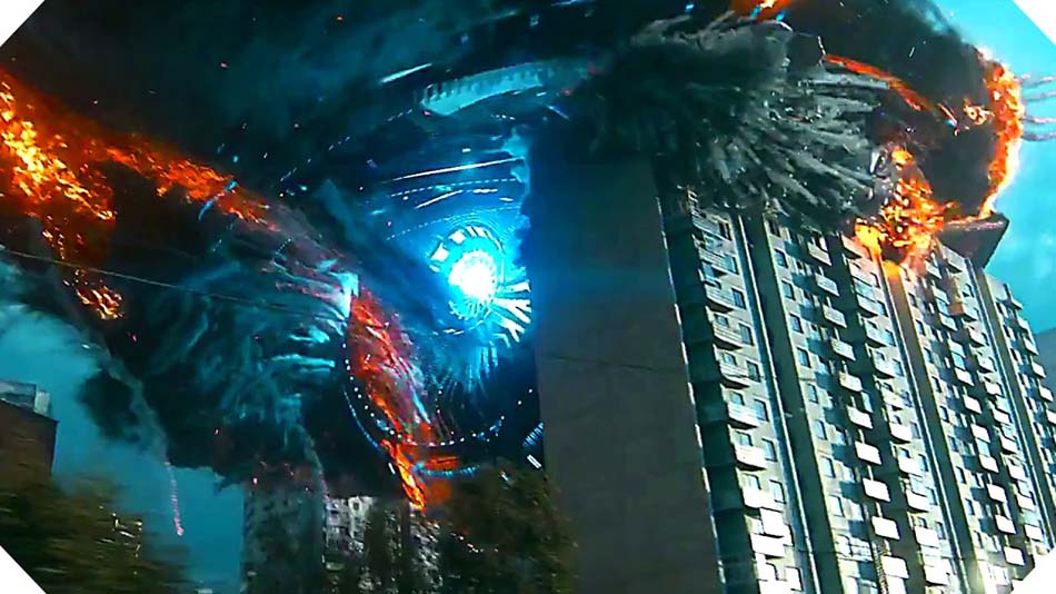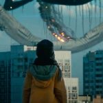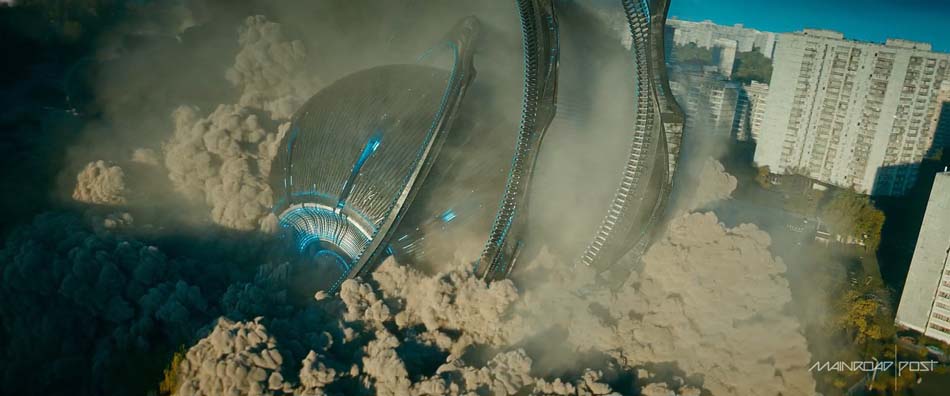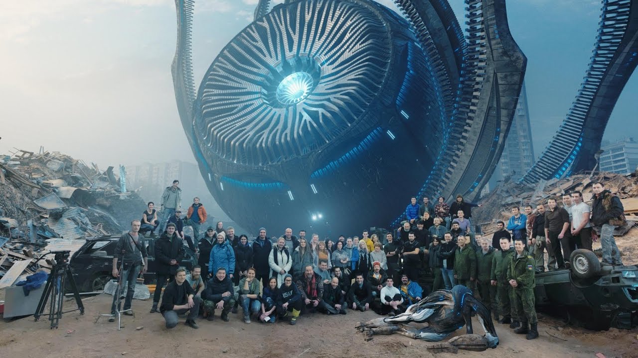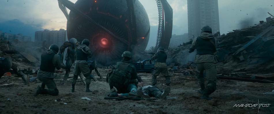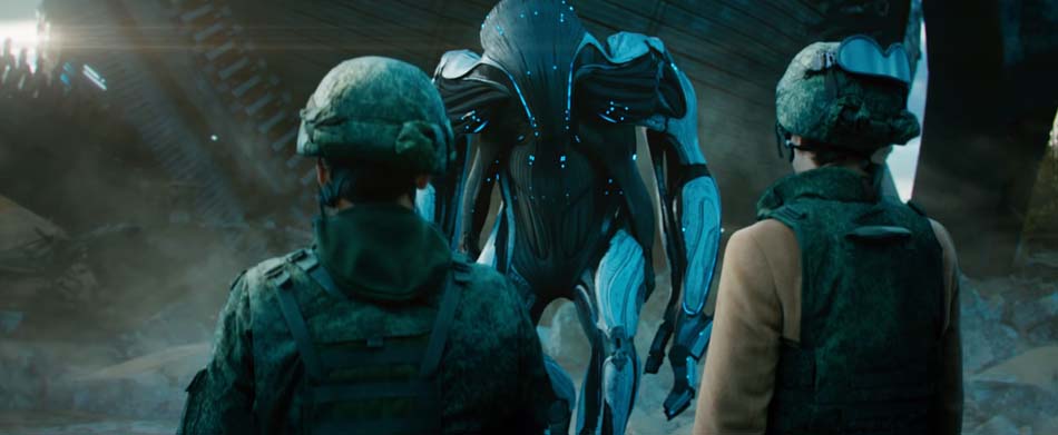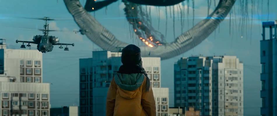 Voici donc ce à quoi un film russe à gros budget dont la majorité est probablement partie à la VFX peut ressembler. La première scène s’ouvre sur Yulia, jeune femme dans le début de la vingtaine, assise avec son chien sur une colline dans un parc d’une ville russe. Un monologue en voix-over, de belles couleurs de fin de journée, un visuel très travaillé avec les tracés rectilignes que lancent en l’air les buildings et autres HLM du quartier. Et tout à coup, on est dans l’espace, proche d’un vaisseau spatial sphérique autour duquel gravitent trois anneaux métalliques en mouvement. Du bleu, du noir, du gris, des étoiles, la Terre en arrière-plan, et une pluie de météorites frappent le vaisseau, qui va dévier de sa trajectoire initialement prévue pour s’écraser dans cette même ville russe, où Yulia, son nouveau petit-ami Tyoma, et sa meilleure copine Svetlana, observent le phénomène galactique. Cette dernière périt lors du crash du vaisseau, alors que le couple survit et décide de venger la mort de la demoiselle en attaquant les extraterrestres. S’ensuit une série de rebondissements qui concernent d’une part la première histoire d’amour Tyoma-Yulia, la deuxième histoire d’amour Yulia-Hijken (l’alien sympa dans un corps d’humain évidemment fort séduisant, qui crée un contact avec la race humain), et d’autre part, la résolution du conflit père-fille, et, éventuellement, la gestion de la crise des envahisseurs cosmiques.