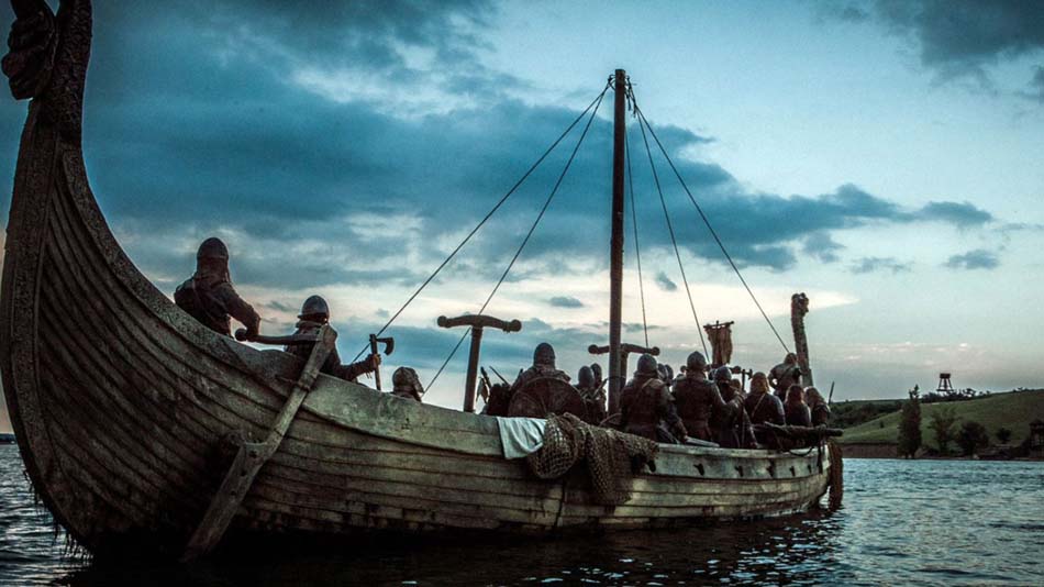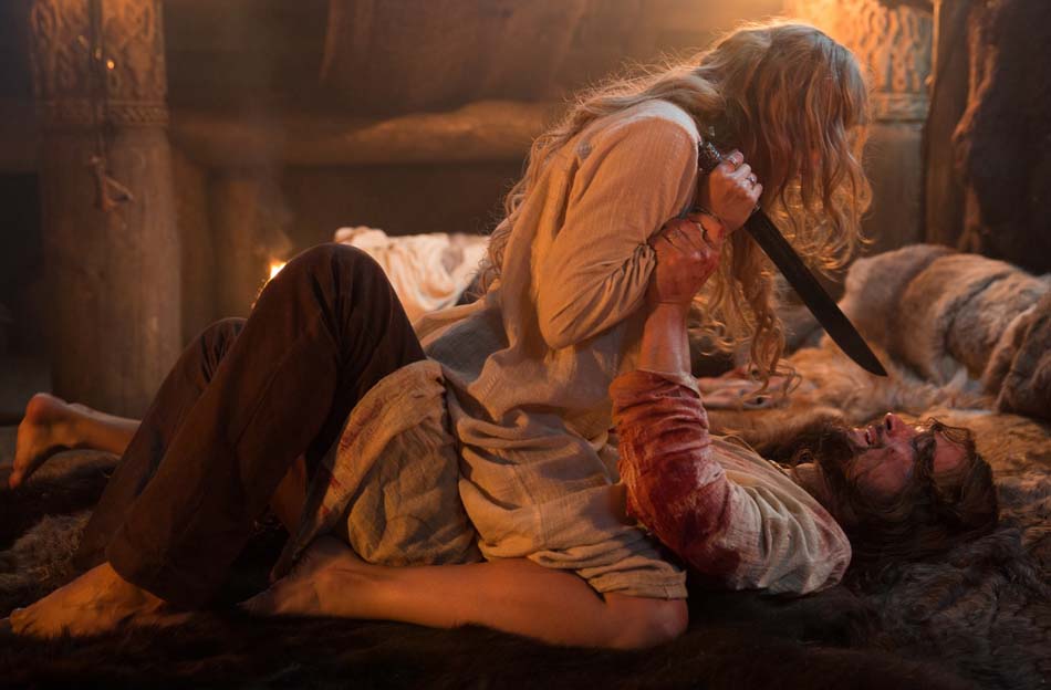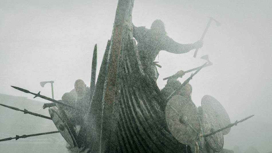 Le film revisite les évènements historiques pour nous offrir avant tout le spectacle d’une belle saga guerrière, menée par des vikings poilus, barbus, vêtus de peaux de bêtes, tatoués, crasseux et sauvagement rustres. Des vrais de vrai, bruts de décoffrage, usant de la boue locale en lieu et place de la mousse à raser, domptant les femelles rebelles à grands coups de buttoirs virils et massacrant tout sur son passage. Les scènes d’offensive et de représailles se succèdent, avec leurs lots respectifs de cris gutturaux, brutalités, tortures, mises à sac, incendies et meurtres en tous genres. Elles sont magnifiées dans leur beauté belliqueuse à grand renfort de ralentis, distorsions sonores et autres effets spéciaux.