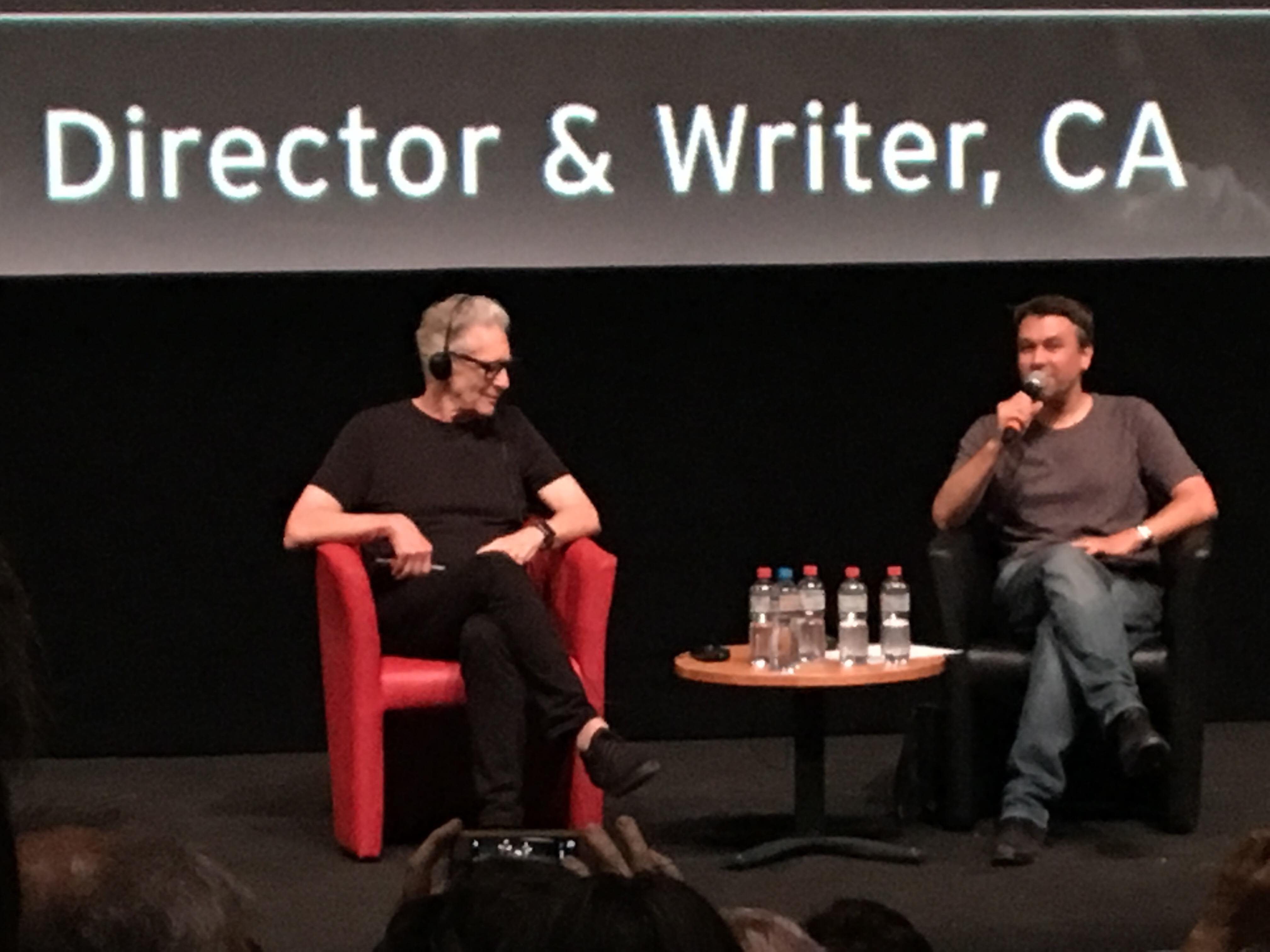 Questionné sur le présent et l’avenir du cinéma, Cronenberg avoue qu’il ne regarde plus beaucoup de films mais énormément de séries, sur Netflix entre autres. Même s’il reste un fan de cinéma, le réalisateur est récemment arrivé à la constatation que les films ne permettent pas de tout exprimer et que seul les romans, d’après lui, laissent la liberté à l’auteur de transmettre la crudité (« crudeness », brutalité et réalisme en quelque sorte) de ses pensées. Avec les séries télé, il remarque que cette liberté est déjà plus présente et nous confie qu’il serait très intéressé par l’écriture d’un tel projet (plus qu’à attendre en espérant que cela se fasse). Concernant la « mort » du cinéma (dans le sens que les séries prennent de plus en plus d’importance et de crédibilité dans la manière de raconter des histoires), il ne voit pas ce changement comme quelque chose de triste. Selon lui, il s’agit seulement d’une transformation (on l’aura compris, Cronenberg adore les métamorphoses) et d’une occasion de découvrir des nouvelles formes d’art.