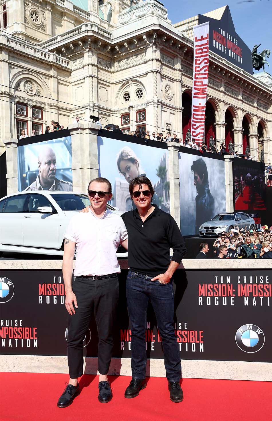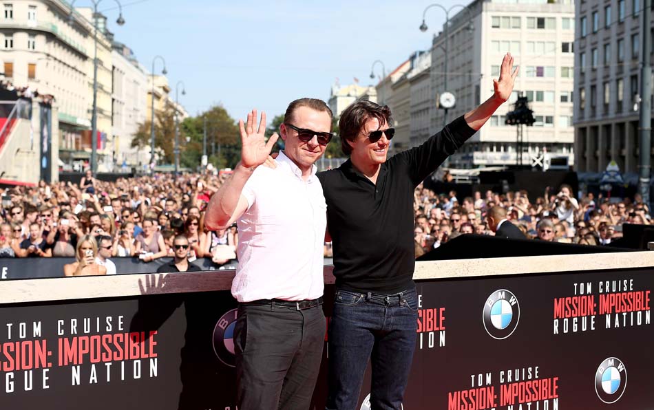 Simon Pegg (L) and Tom Cruise attend the world premiere of ‘Mission: Impossible – Rogue Nation’ at the Opera House (Wiener Staatsoper) on July 23, 2015 in Vienna, Austria. (Photo by Andreas Rentz/Getty Images for Paramount Pictures International)