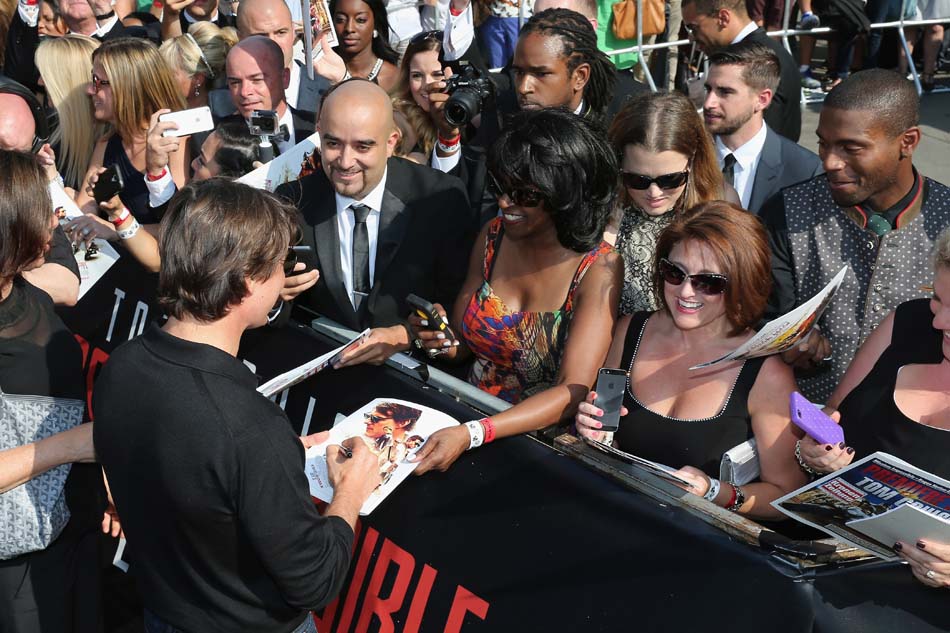 Tom Cruise poses with fans as he attends the world premiere of ‘Mission: Impossible – Rogue Nation’ at the Opera House (Wiener Staatsoper) on July 23, 2015 in Vienna, Austria. (Photo by Andreas Rentz/Getty Images for Paramount Pictures International)