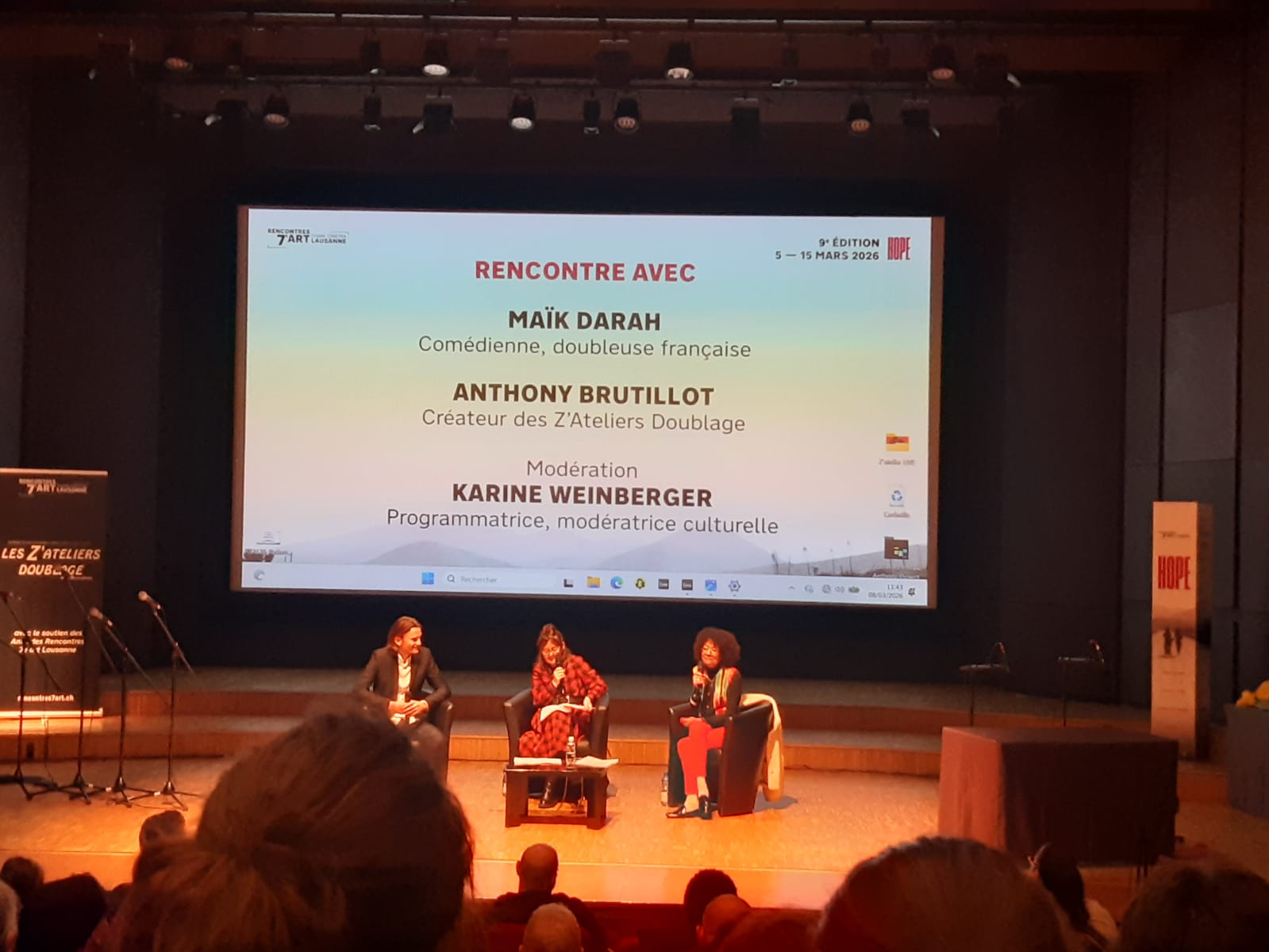 Ce dimanche 8 mars 2026, une rencontre inédite et originale eut lieu dans le cadre de la manifestation culturelle. Les festivaliers-ières purent voir et surtout entendre, la comédienne Maïk Darah au sein du Casino de Montbenon à Lausanne.