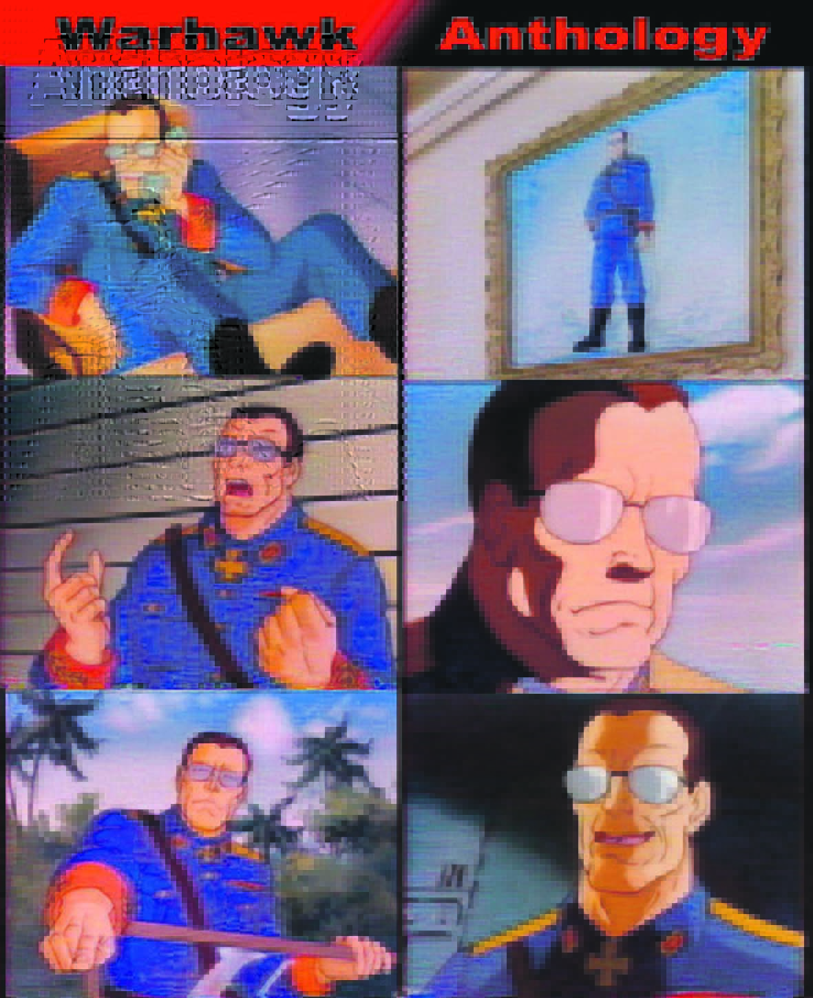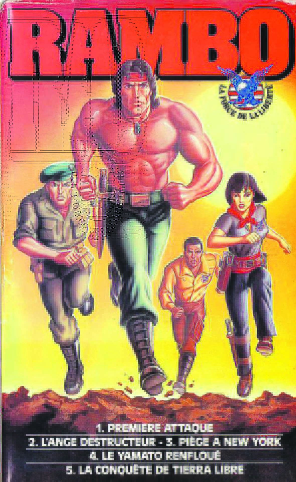La VHS dont vous pouvez admirer la jaquette ci-contre contient 5 épisodes constituant un métrage complet d’1h40 minutes, sans pause ni temps mort : une orgie de destruction ininterrompue de véhicules de toutes sortes (centaines de tanks, nouveau prototype de bombardier, croiseurs de plusieurs kilomètres de long…), d’explosions gigantesques, de raccords foireux, de combats acharnés dans tous les paysages possibles, de bases ravagées, de guerre sans fin pour prendre le contrôle de Tierra Libre, un pauvre petit pays pacifiste qui ne méritait vraiment pas un tel acharnement. Et surtout, c’est Rambo pire que jamais, qui court sans répit en démolissant des armées de militaires à lui tout seul, matériel compris, Rambo qui détruit des bases entières tout en skiant peinard, qui fait de la chute libre pour attaquer l’aviation ennemie, Rambo qui lance des pieux explosifs avec son arc de chasse, Rambo qui explose tout avec une sarbacane lance-roquettes, Rambo qui enrôle des gamins dans l’armée, Rambo qui fait des planchettes japonaises à des colonnes de pierre de plusieurs tonnes, Rambo l’invincible, l’infatigable, l’indestructible, l’omnipotent, le surprenant, le stratège, le vanneur, l’Agénésie aréolo-mamelonnaire, le Héros de la Liberté. Rajoutez à tout ça des méchants tous plus hallucinants les uns que les autres, menés de main de fer par un boss ultra persévérant à l’accent allemand digne des meilleures comédies françaises : Warhawk, le seul et unique méchant intergalactique qui ose faire tanguer des barques remplies de bananes pour faire régner la Terreur !
