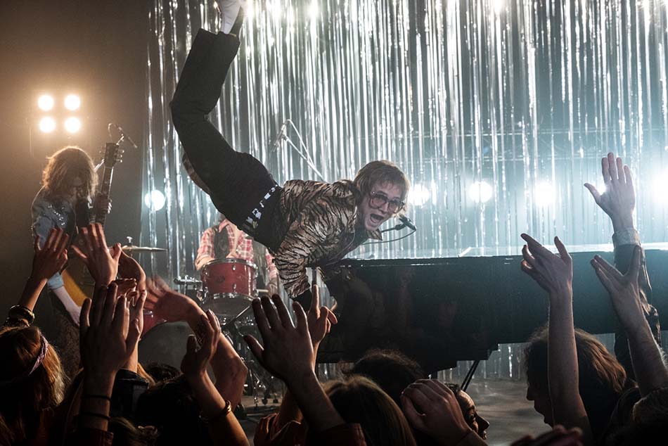 La première scène du film s’ouvre sur le chanteur qui avance dans un couloir gorgé de lumière (comme s’il allait monter sur scène) pour finir en réalité aux Alcooliques Anonymes. Son costume pour le moins exubérant ne lui pose aucun problème pour commencer à se dévoiler au groupe (et aux spectateurs). La scène qui suit est un souvenir d’enfance qui relate le manque d’amour d’un père totalement apathique vis-à-vis de son fils (cette relation toxique a chamboulé la vie de l’artiste à jamais, et l’a poussé dans le cercle vicieux de la drogue, du sexe, de l’alcool et des achats compulsifs). La suite du métrage est relativement banale, premières chansons, tandem avec son parolier Bernie Taupin (qui a écrit quasiment toutes ses chansons), premiers succès, trahisons de ses proches et la descente aux enfers dans l’alcool et la drogue.