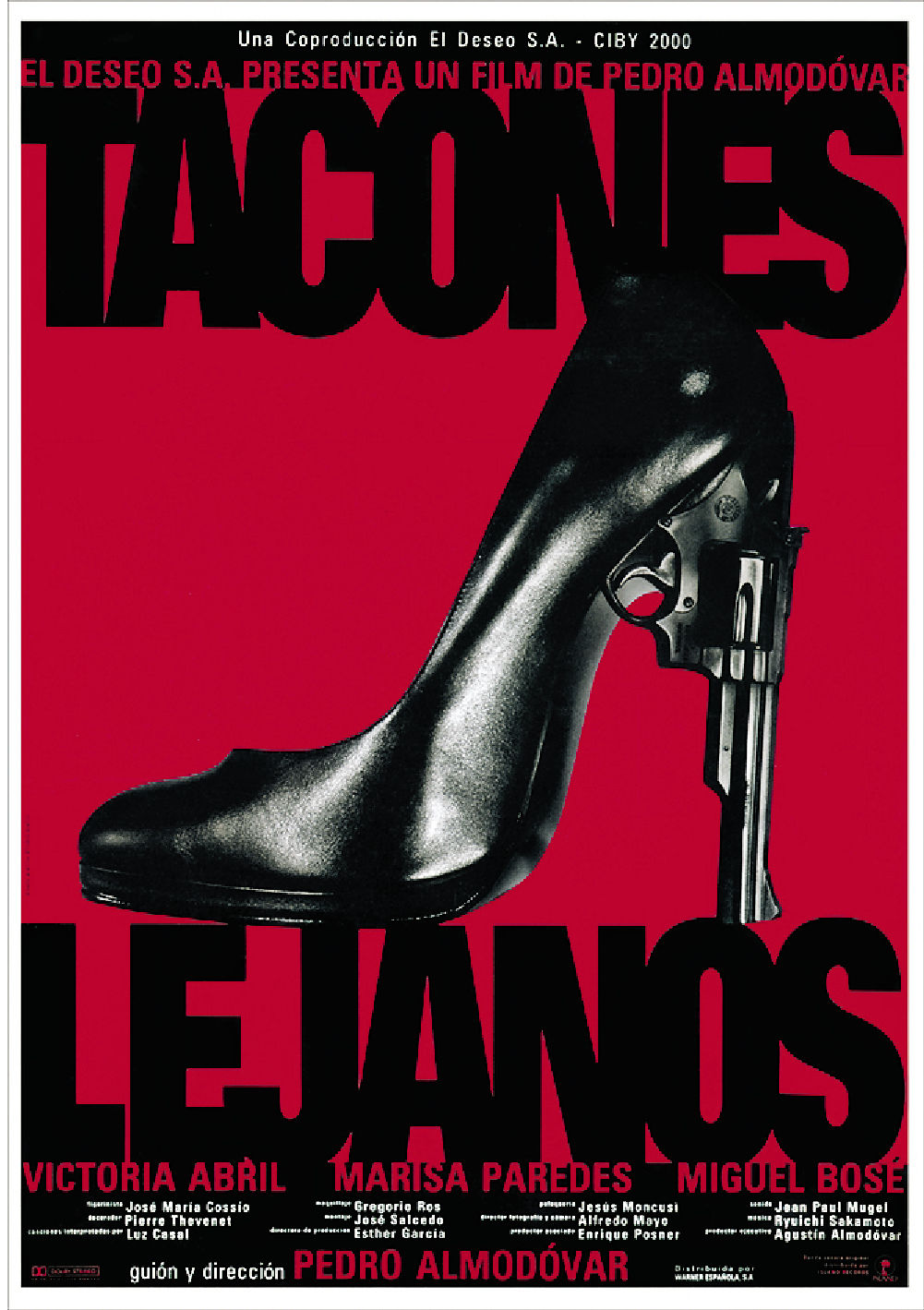 Je vois pour la première fois l’affiche de Talons Aiguilles sur la pochette d’une compilation de musique de films, aux côtés de celles de The Full Monty et de Pulp Fiction. Le fond rouge, l’escarpin noir et surtout son talon en canon de pistolet m’accrochent tout de suite l’œil. « Des femmes et des flingues! », me crie l’image ! Il n’en faut évidemment pas plus pour que ce film prenne une dimension mystérieuse et étrangement excitante pour l’adolescent que je suis alors. Puis, il y a la musique, bien sûr, qui m’envoûte immédiatement, avec ses cordes à la mélancolie superbe et ses notes au supplice merveilleux. Elle est signée Ryuichi Sakamato, qui m’est à l’époque inconnu, mais qui va vite devenir une de mes références musicales, quelques années plus tard, avec Furyo et Le Dernier Empereur.
