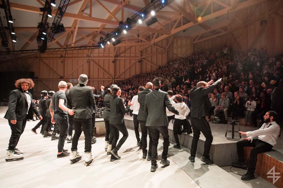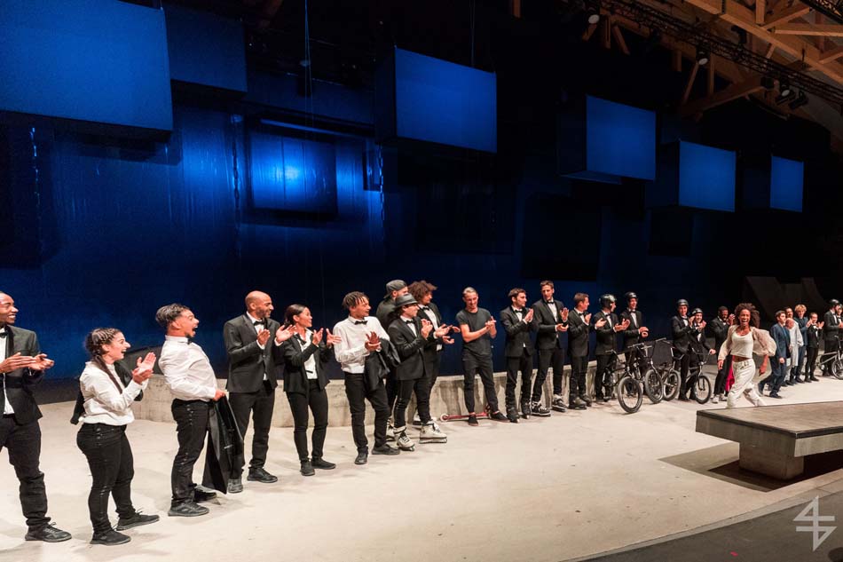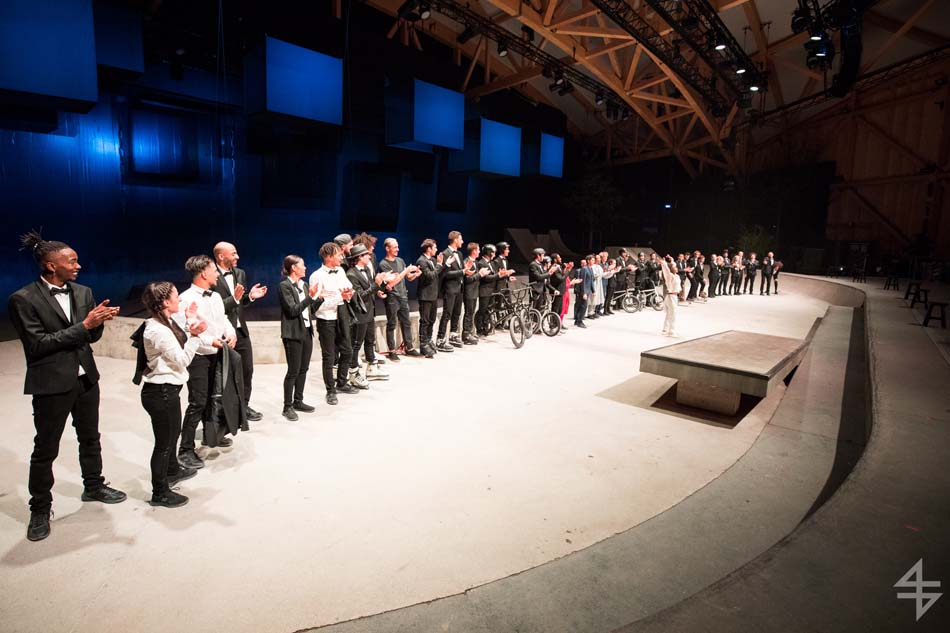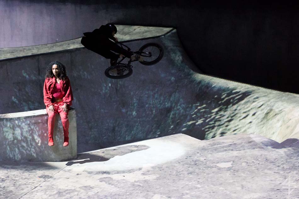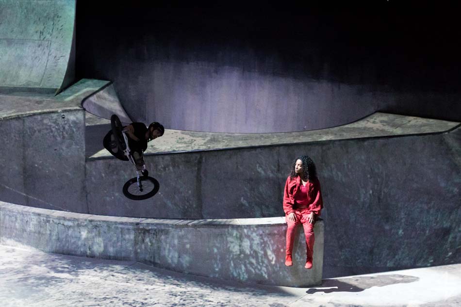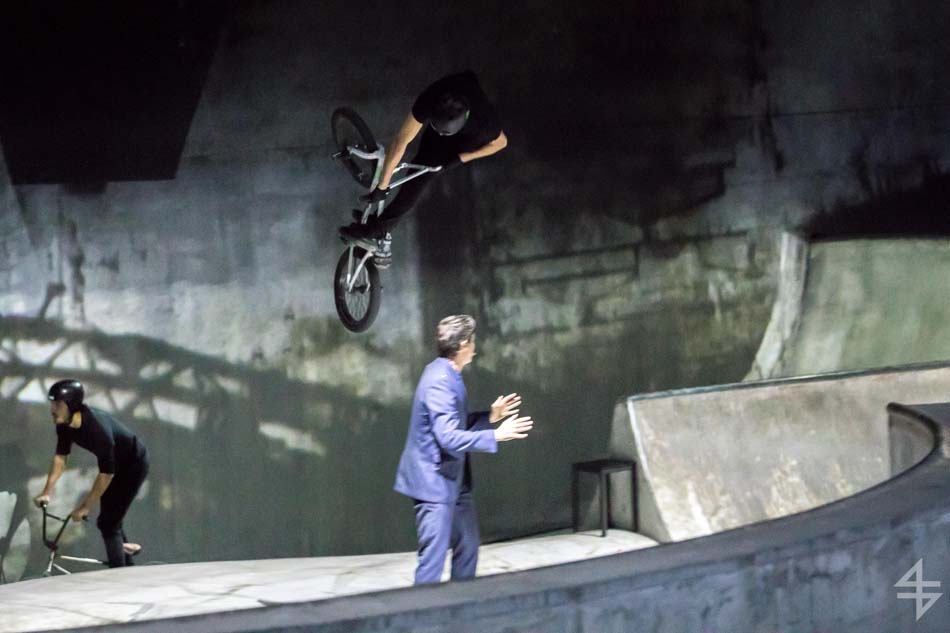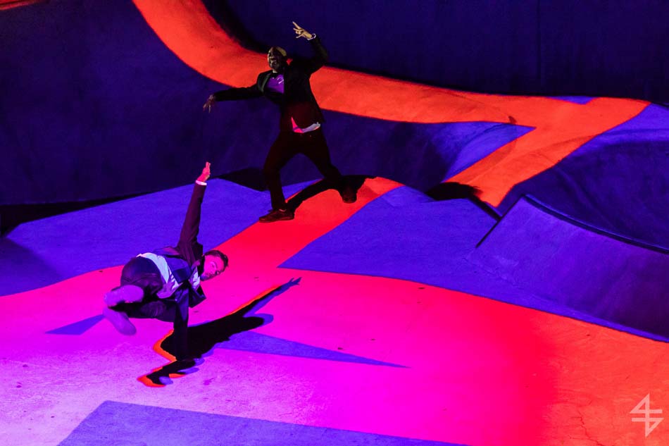 Dès le début, le ton est donné, le spectacle va être spéculaire avec pas moins de 40 artistes suisses et internationaux. Il est vrai que le mapping qui habille le skatepark est de toute beauté et de surcroît, avec les danseurs qui donnent une impression de flottement emportant dès la première scène le public. Outre l’habillage du décor, une danse s’opère entre les différentes disciples, les danseurs, skateboarders, les riders en BMX, patineurs et un incroyable traceur, Caryl Coordt-moller. Celui-ci propose un parcours à travers le skatepark, en effectuant d’incroyables figures sur lui-même.