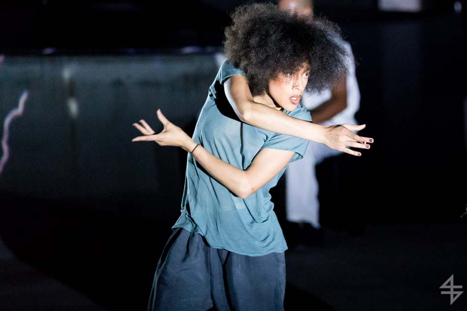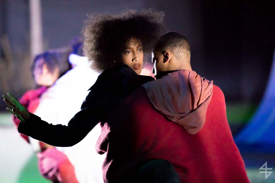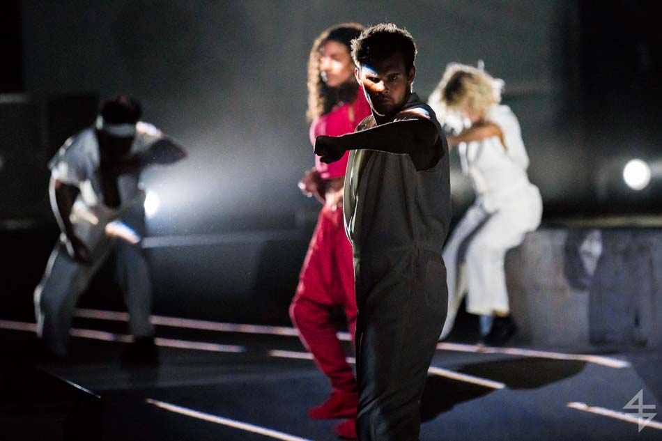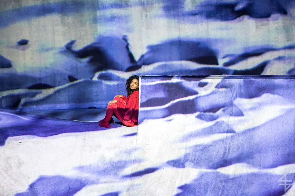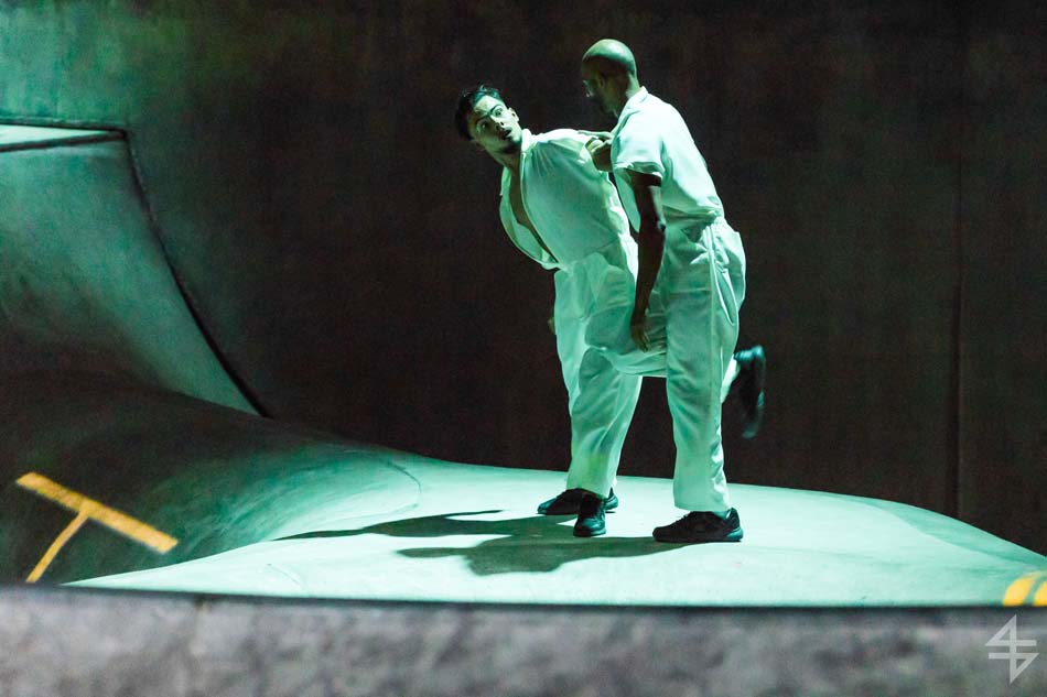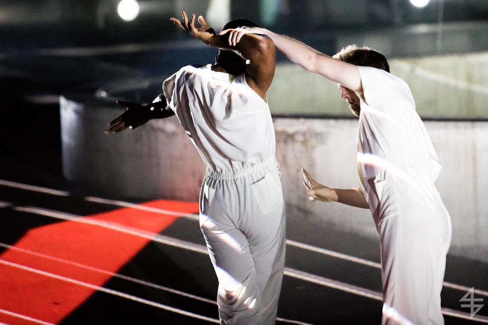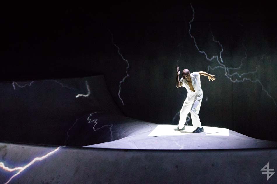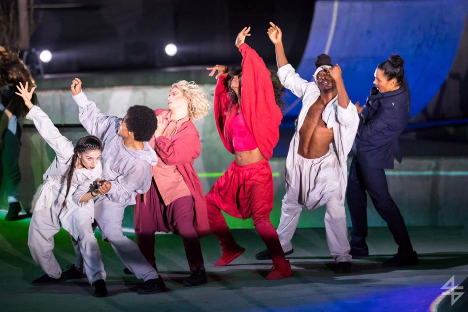 Dès le début, le ton est donné, le spectacle va être spéculaire avec pas moins de 40 artistes suisses et internationaux. Il est vrai que le mapping qui habille le skatepark est de toute beauté et de surcroît, avec les danseurs qui donnent une impression de flottement emportant dès la première scène le public. Outre l’habillage du décor, une danse s’opère entre les différentes disciples, les danseurs, skateboarders, les riders en BMX, patineurs et un incroyable traceur, Caryl Coordt-moller. Celui-ci propose un parcours à travers le skatepark, en effectuant d’incroyables figures sur lui-même.