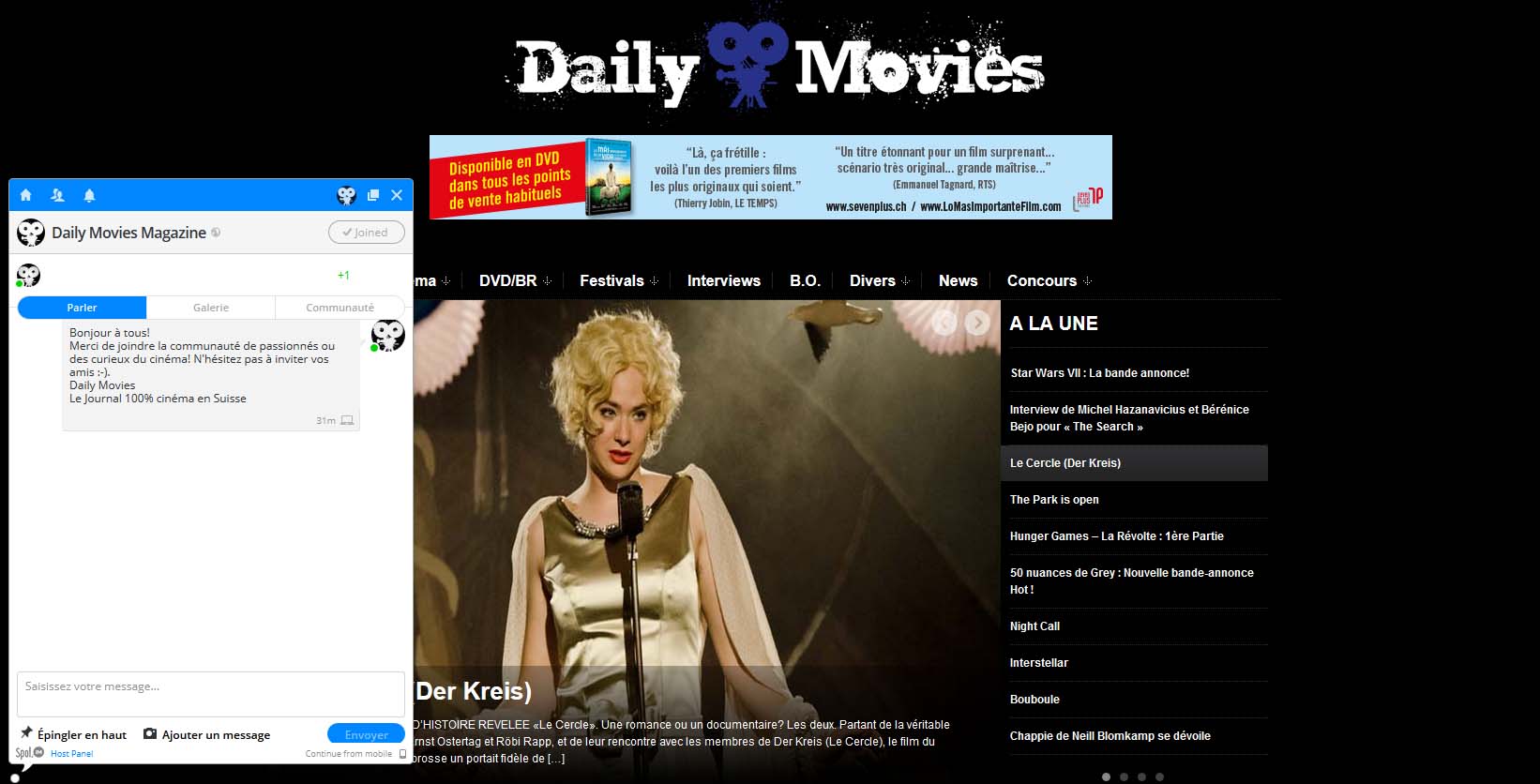Si vous regardez en bas à gauche de cette page, un cercle avec le logo de Daily Movies, contourné par le terme « Communauté » est apparu depuis votre connexion. C’est Spot.IM, notre nouveau salon de discussion pour tous les passionnés de cinémas mais aussi pour ceux qui veulent parler de tout ce qui concerne l’audiovisuel ainsi que tout ce qui touche de près ou de loin le cinéma.