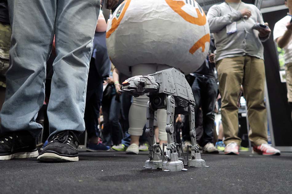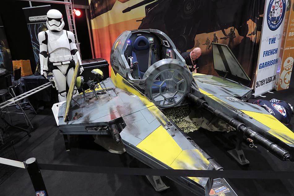 Au niveau des stands, on a pu sourire avec la présence de l’office du tourisme de l’Irlande mettant en avant une des scènes célèbres de l’épisode 7. La société Propel a fait très fort en prenant une immense partie de l’espace disponible pour présenter ses nouveaux drones représentant des vaisseaux (d’ailleurs très bien fait) tirés de l’univers Star Wars. Une reconstitution des tranchées de l’étoile noire et de la forêt d’Endor servant de décors à la présentation de ces drones ont fait forte impression. Il y avait également les habituels stands des diverses garnisons, mais celles-ci semblaient un peu avoir été mises à l’écart pour faire plus de place au stand très nombreux des marchands en tout genre. L’espace réservé aux dédicaces et celui présentant les costumes du future « Rogue One » prenaient également une part importante de l’espace disponible. Les créateurs de droïdes étaient également de la partie tout comme les cours de maquillage et autres tatoueurs et artistes en peintures et sculptures. Enfin les plus courageux pouvaient partir à l’assaut de la queue interminable de la boutique officielle, 1h30 d’attente minimum.