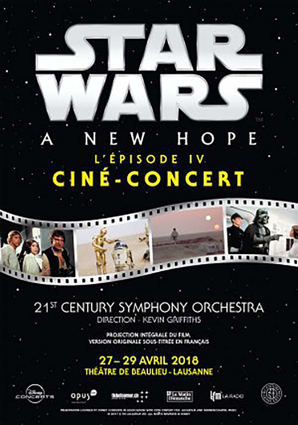 La Saga « Star Wars », imaginée par George Lucas, a bouleversé le paysage cinématographique hollywoodien et fascine toujours autant. Avec son histoire universelle, ses personnages attachants et ses effets spéciaux révolutionnaires, la saga Star Wars est devenue une icône de la culture américaine. Alors que l’intégralité du film est projetée en version originale anglaise, sous-titrée en allemand, et en haute définition sur un écran de plus de 12 mètres, les 80 musiciens du 21st Century Symphony Orchestra de Lucerne, sous la direction de Ludwig Wicki, jouent à la note près la partition originale. L’occasion de revivre toute la magie de l’œuvre composée par John Williams, récompensée aux Oscars, Golden Globe et Grammy.