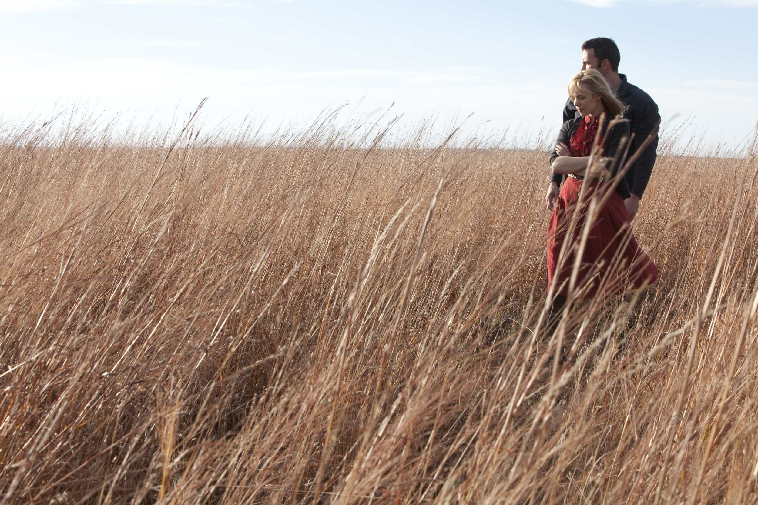 Plus démonstratif que jamais – tout en s’avérant paradoxalement plus impénétrable qu’à l’accoutumée –, ce nouveau film de Terrence Malick hyperbolise tous les éléments qui ont fait de son cinéma un art si particulier. À force de répétitions, les déambulations réflexivo-contemplatives d’Olga Kurylenko, finissent ainsi par lasser. Il est vrai que l’actrice, aussi remarquable son jeu soit-il, passe la majeure partie de son temps à sautiller et à gambader. Toutefois, cela n’ôte rien à l’immense talent de mise en scène du maître. Nul autre ne manie la caméra avec autant de grâce que cet homme. Celle-ci se déplace, en apesanteur, filme des corps qui se touchent, qui s’effleurent puis s’évitent, les entoure, s’inscrit dans leur prolongement pour finalement les dépasser dans un mouvement d’une extraordinaire légèreté. Ce que filme Malick, au fil de nombreuses césures elliptiques (qui finissent par suspendre toutes notions de temporalité), c’est le cycle du sentiment et de la relation. Les figures cycliques n’ont d’ailleurs de cesse de se répéter à l’écran : manèges, ventilateurs, marrées, éléments… évoquant indéniablement l’idée d’un éternel retour hautement nietzschéen. Les valises se remplissent, puis se vident, encore et encore, au fil des colères, des doutes et des déceptions d’un couple qui se délite mais qui n’a pas la force requise pour véritablement choisir.