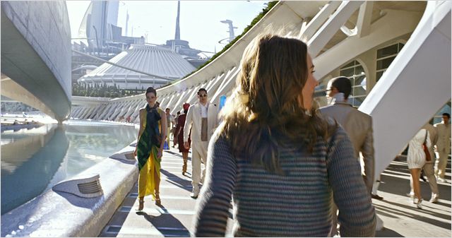 Le résultat final est malheureusement en demi-teinte. La première moitié du film est excellente. On y découvre un monde spectaculaire, des personnages attachants et relativement bien développés, un traitement graphique superbe et juste ce qu’il faut de mystère pour attendre la suite avec impatience. C’est bien simple, les séquences de découverte de Tomorrowland (le lieu, pas le film) sont assez somptueuses et nous font retomber en enfance, les yeux brillants, un peu comme l’avait fait à l’époque « Jurassic Park » lors de l’arrivée dans le parc. La comparaison est plus que flatteuse, mais totalement justifiée par ce premier acte de très bonne facture. Forcément, on trépigne d’impatience d’en apprendre plus sur les enjeux de ce monde onirique et de voir des séquences d’anthologie dans un climax surprenant. Commence alors, avec l’arrivée des héros dans Tomorrowland, un développement scénaristique fainéant et sans surprises.
